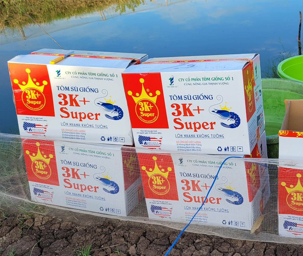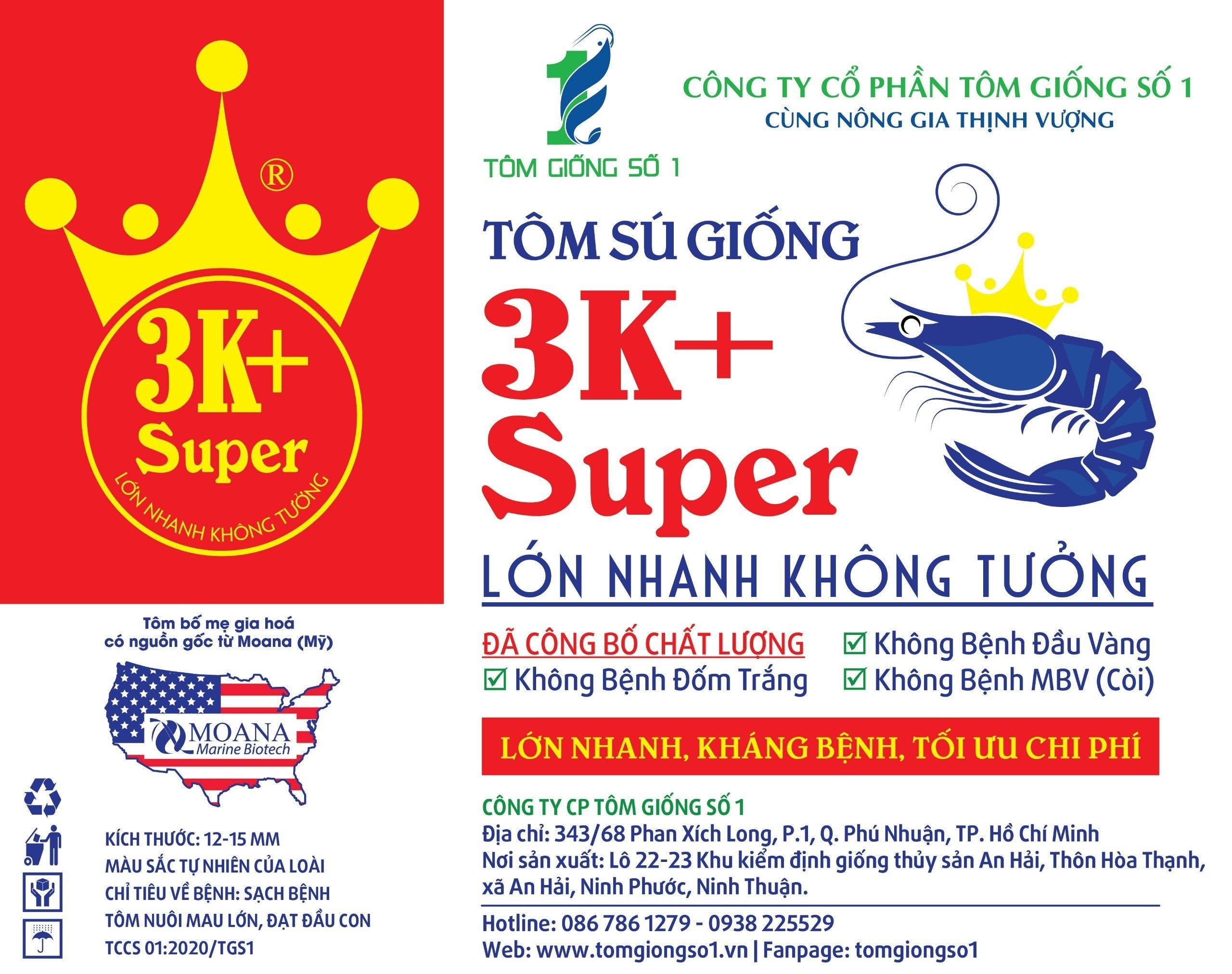 Là sản phẩm mới nhất của dòng tôm sú giống, 3K+ Super là sản phẩm hợp tác chiến lược giữa Công Ty Cổ phần Tôm Giống Số 1 và Công ty Cổ phần Moana (Hoa Kỳ) mang trọn vẹn những giá trị cốt lõi mà hai công ty đang theo đuổi. Đang được nhà nuôi tôm ưa chuộng khắp cả nước, phù hợp với các vùng nuôi tôm tại Việt Nam.